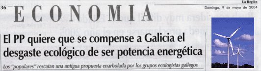 La Xunta de Galicia, primero no pone impedimentos para que destrozen nuestros montes y nuestros ríos (dejando hacer Parques Eólicos y minicentrales en cualquier lugar y con estudios ambientales deplorables) y ahora el 09-05-2004 reclama que se compense a Galicia por el desgaste ecológico por ser potencia energética. Realmente resulta curioso e impactante, por no decir otra cosa...(Leer la noticia).