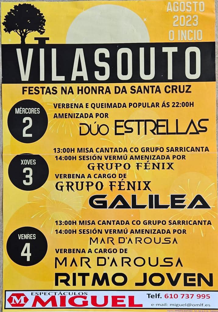 Cartel das festas de Agosto enVilasouto (Envio do corresponsal en Calvos: Cristián) Vilasouto Festas 2023 o 02/03/04 de Agosto Gracias Cristian por mandarnos esta fotografía o día 06/07/2023.