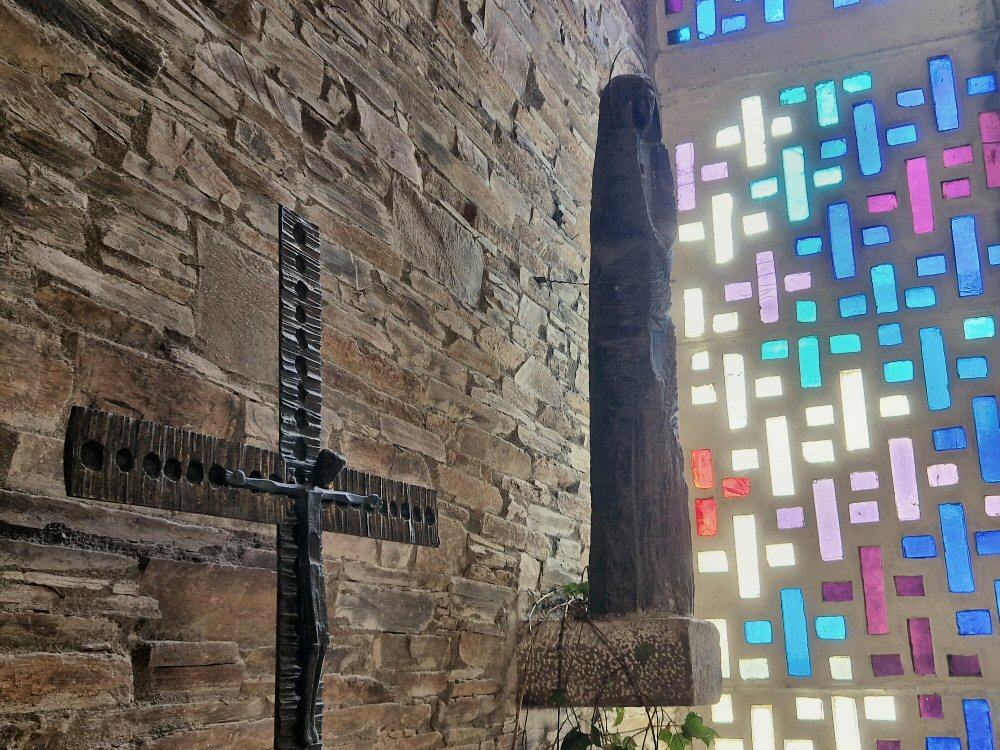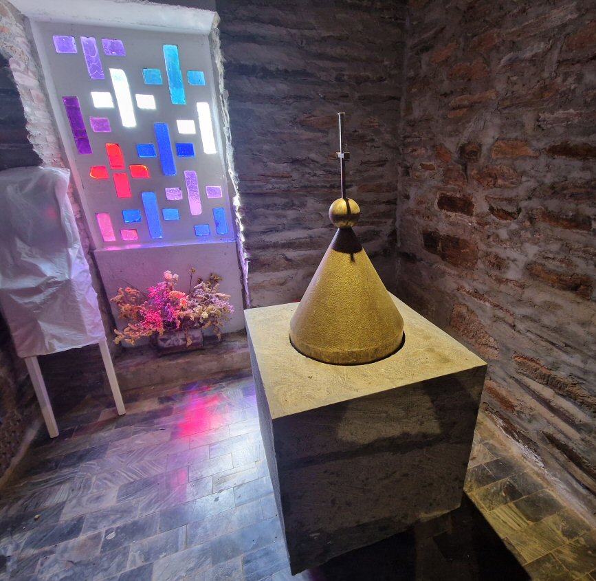 cruz. o lugar onde está, o baptisterio resalta a peza con esa luz
