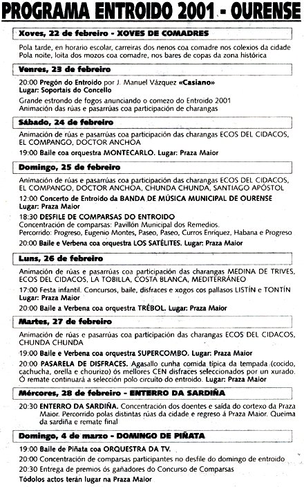 El pregón del entroido 2001 lo hizo "Casiano" , J. Manuel Vázquez el viernes 23 de febrero a las 20 horas en los soportales del Concello de Ourense.