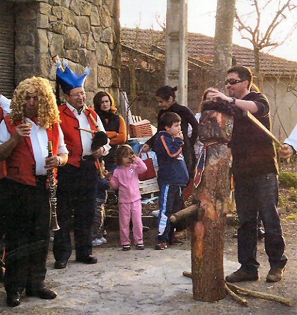 En esta fotografía ya tienen el meco hecho, todo a machada y lo trasladan para bautizarlo, en los últimos años este meco se llamó Roldán, Aznar, Zapatero, Fraga,Sadam, Bim laden. Julián Muñoz, etc.