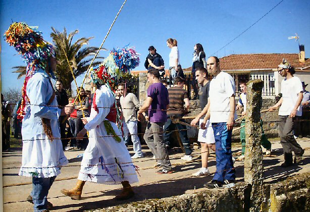 Una vez metidos en la vorágine de la fiesta, se entiende por qué todos van con ropa y zapatos cómodos. La cita tiene dos protagonistas absolutos: el meco -un gran tronco de madera que ha sido tallado para simular una figura humana- y los troteiros o vergalleiros , que con una vestimenta peculiar van guiando, a base de latigazos que propinan con una vara larga y flexible, a los mozos que tiran del carro en el que va el meco.