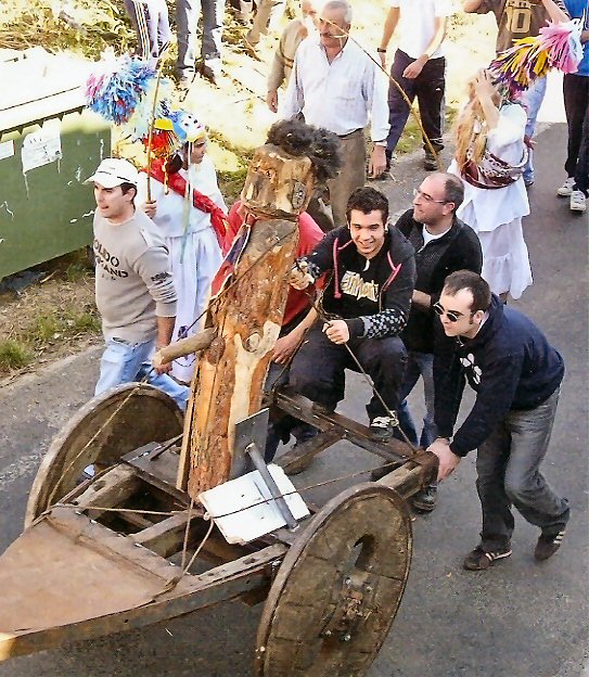 La tradición, documentada desde 1730, cuenta que el tronco representa a un personaje malvado que es paseado como castigo, pero ayer, por ejemplo, el cartel del tronco llevaba el nombre de Obama. «Isto é algo bastante novo, e cada ano póñenlle o nome dalgún que destacou para ben ou para mal, pero na miña época non tiña nome ningún, e que eu recorde tampouco na época do meu pai e meu avó», explica Manuel, que, a sus 66 años, sigue sin esfuerzo las subidas y bajadas del carro por las empinadas cuestas del pueblo.