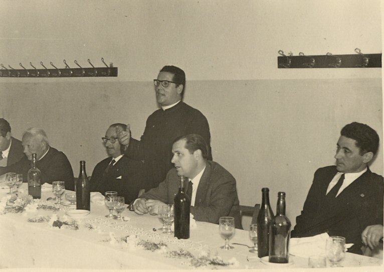 Ourense 1960 comida. De derecha a izquierda. Basilio y Perez de Juan, el director Ramón Viso, ?, José Saborido.