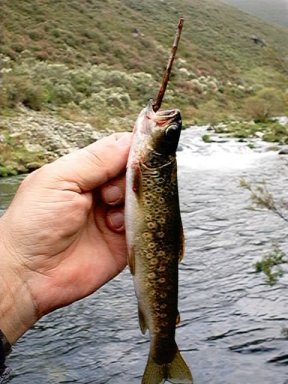 Troita do meu río. Fotografía do autor da www. "Imos por remate a este capítulo primeiro da troita, miña señora, falando dos seus enemigos, que son moitos porque tódalas cousas boas teñen enemigos abondo, xente que tenta de facerse co elas como sexa, e xente á que lle dá noxo que haxa cousas tan boas e quere que non as haxa. A troita que, xunto co porco e mailo viño, é un dos pilares fundamentais da civilización occidental, ten os seus peores enemigos en: 1) A muller, que non che deixa ir a pescar, é un caso típico e tópico de envexa e ciúmes; a muller comprende que, entre ti e a troita pode haber unha relación mesmo erótica.