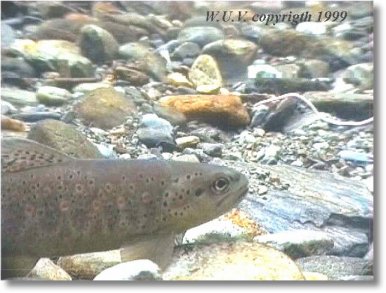 Troita en postura. Fotografía submarina de W.U.V. 2) A lontra, raíña das desfeitas, é quen de deixar valeiro o río, pero convén non esaxerar nin face-lo que os daquela sociedade cun coto no que exterminaron a lontra e viron que foi peor o remedio que a enfermedade porque a lontra facía o máis do seu traballo coas troitas enfermas ou ceibadas, é decir, tiña unha boa función de policía sanitaria e, cando a exterminaron, as troitas foron a peor. Ás mulleres gústanlles moito os abrigos feitos coa pelella da lontra; compriría averiguarmos se ás lontras tamén lles gustan os abrigos de pel de muller; se fora así, podíamos facer que se puxeran unhas contra das outras e deixaran en paz a troita e ós troiteiros. 3) Os fillos de nai, dos que xa falamos; peores cá lontra porque, inda por riba, cos seus pelellos non se fai cousa boa. Pra acabarmos con eles o remedio é longo e dificil; vai dende pór máis vixilancia nos ríos astra mellora-la educación e cultura do país; xa na escola os rapaces tiñan que adeprender que esas cousas non se fan porque son unha burrada como o de queimar o monte ou botarlles escarabellos ás patacas.