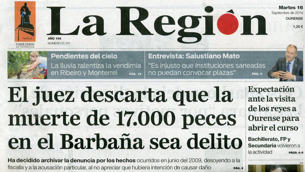 Noutras provincias exactamente igual: famosos os vertidos e morte de troitas do río Cabe en Monforte, que por certo no hai culpables (este é un país bananero) do río Asneiro e o río Deza en Lalín, do Asma en Chantada, do Tea en Mondariz, do río Lérez que se vestiu de blanco non fai moito, o río Umia con novos vertidos, o río Gafos en Pontevedra que non se recupera, vertidos pestilentes no río Lagares en Vigo, por citar algunhas desfeitas deste ano 2014...