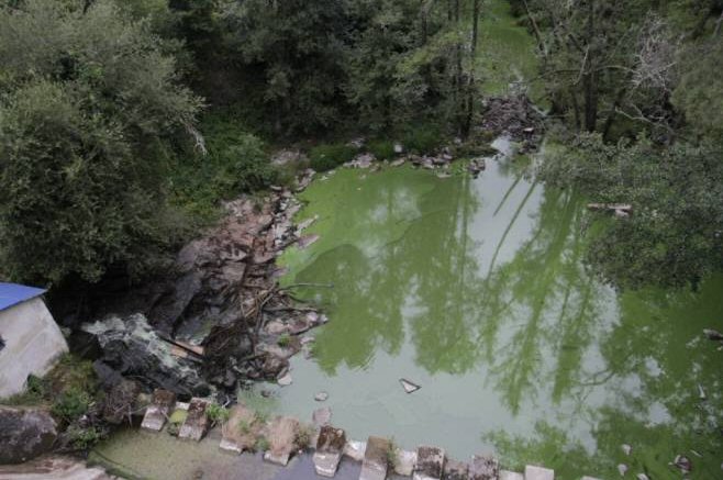 O río Umia contaminado. Encoro de Baxe. Eutrofizado todo o verán. O problema do río Umia é moi serio e ten que ver moito cun encoro irracional que nunca se debeu facer. Un engano os galegos no que o Sr. Hernández, actual conselleiro de Medio Ambiente, tuvo moito que ver. Este encoro naceu para producir electricidade Hidroeléctricas Cortizo, enmascarado en que resolvería o problema das enchentas de Caldas de Reis (estás cada vez son peores) e que daría auga o Salnés (efectivamente está dando auga pero envelenada...).