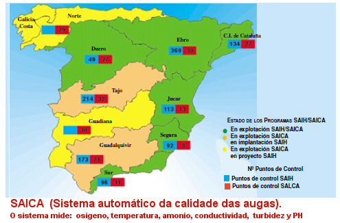 En Galicia hai 13 centros de Control, ou Sistema autómaticos de Calidade da auga (Seica) que son realmente os que miden a contaminación das augas, e ademais hai 100 estación SAIH que están nos encoros, a maioría, e que miden e o nivel do río, caudal, precipitacións, volumen acumulado nos encoros, etc. Non mide nada de contaminación.