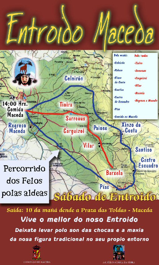 | Detalle del recorrido que harán los felos el sábado día 2 de febrero. | Felo de Maceda, máscara también ancestral del carnaval de Ourense Provincia. |