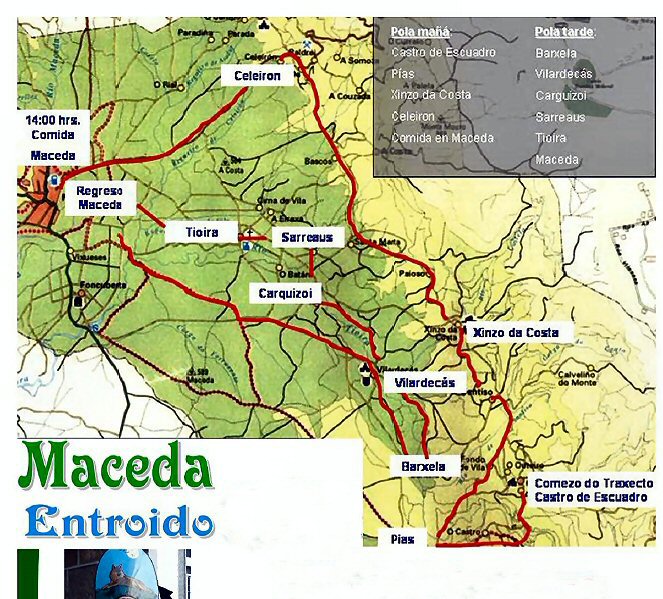 | Detalle del recorrido que harán los felos el sábado día 5 de marzo. La comida será a las 14 horas. | Felo de Maceda, máscara también ancestral del carnaval de Ourense Provincia. |