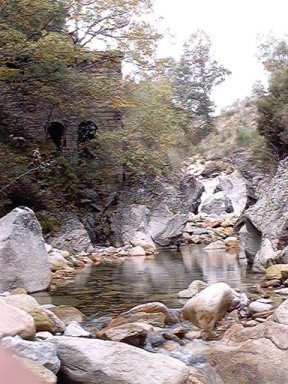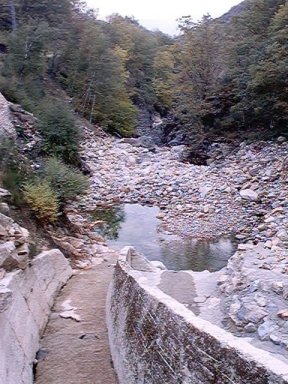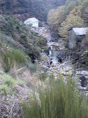| Ver la zona de abajo de la central, el río con corriente de octubre. Por encima el caudal ecológico: un grifo de agua, ni un litro por segundo. De vergüenza. | Este es el río justo debajo de la turbina de la central, el río llevaba agua abundante. |