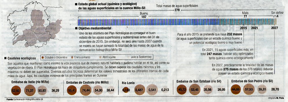 Das 278 masas de auga superficiais seica 197 están en bon estado? e 77 están mal. Nun anos das 197 poucas quedarán en bon estado e haberá que volver a empezar, esto parece un chiste...