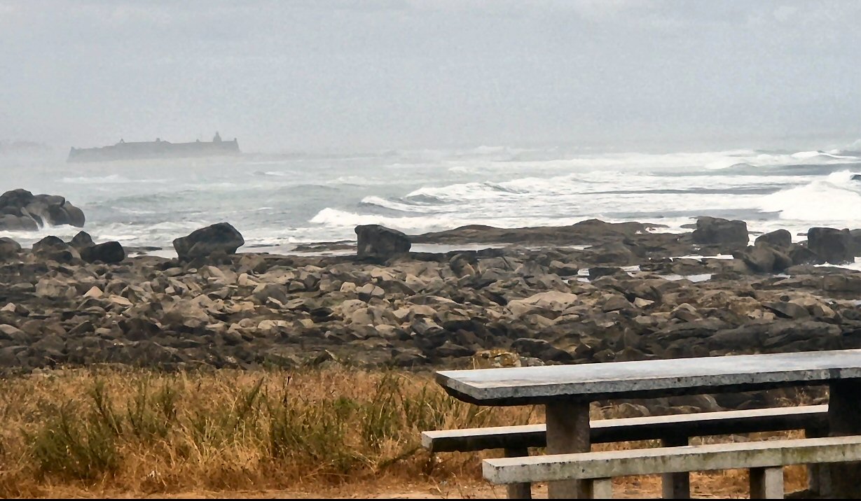 as ondas rompendo na zona, hai ondas no medio, e non hai rochas no medio, si nas beiras.