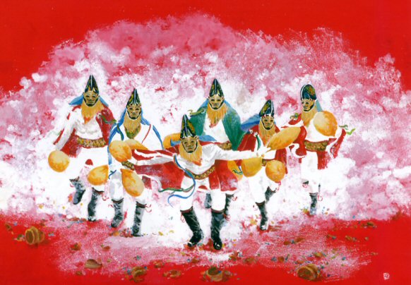 entre sí las vejigas y haciendo sonar las campanas que llevan ceñidas a la cintura.
