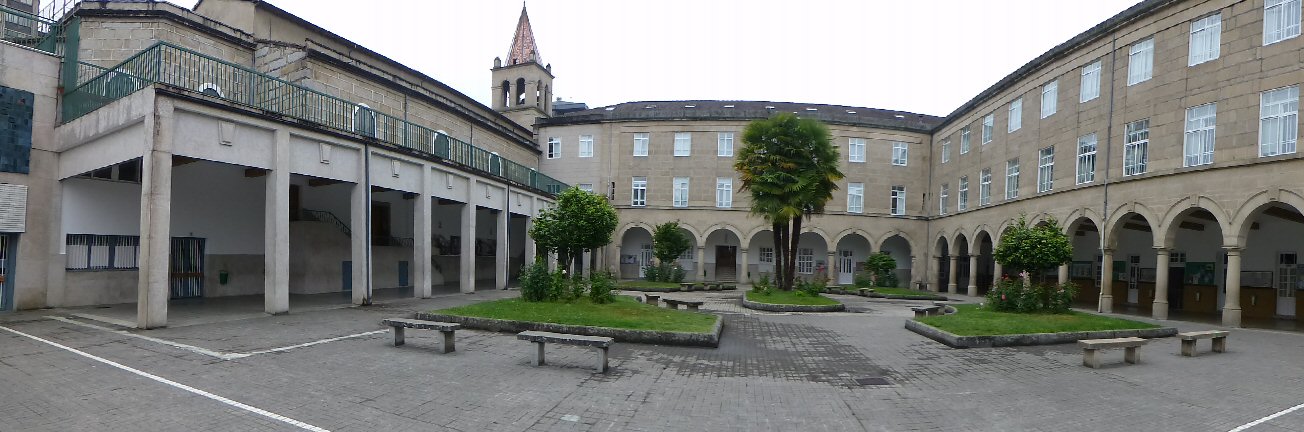 Vista del patio muy cambiado. A la izquierda taparon el frontón de nuestros tiempos con poca estética, por cierto. Podrían seguir los arcos de todo el conjunto y quedaría maravilloso; si se levanta D. José Saburido o D. José Peiteado las manda tirar. En el antiguo campo de baloncesto pusieron esas palmeras y esos bancos...