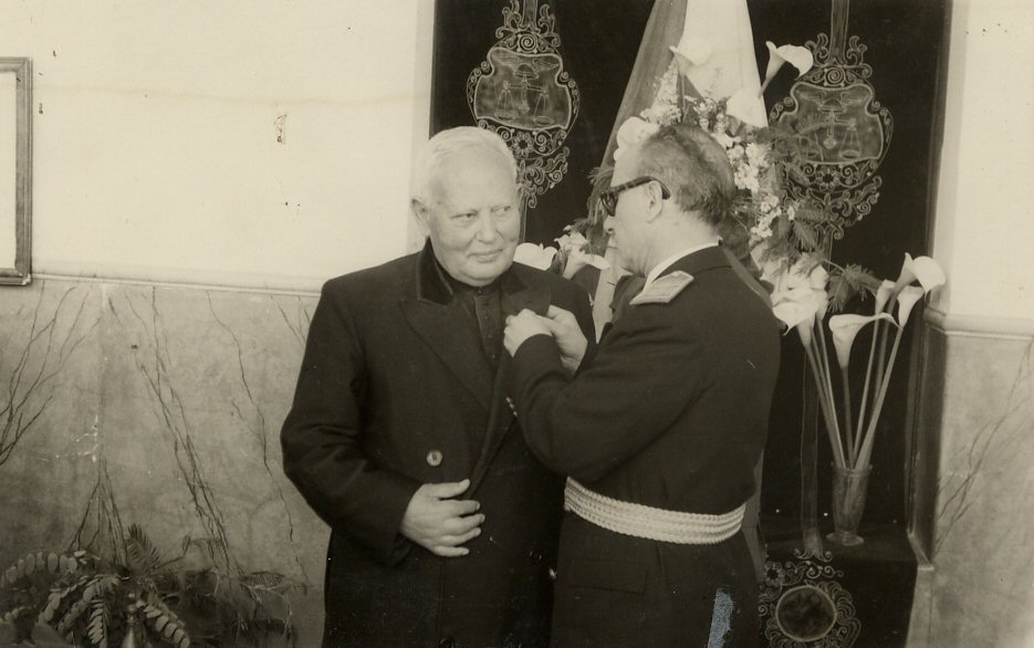 Ourense 1954. Entrega de la medalla al trabajo a D. José Saborido (me cuenta D. Urbano que en realidad era Saburido pero por un error en la partida de nacimiento quedó así la cosa)