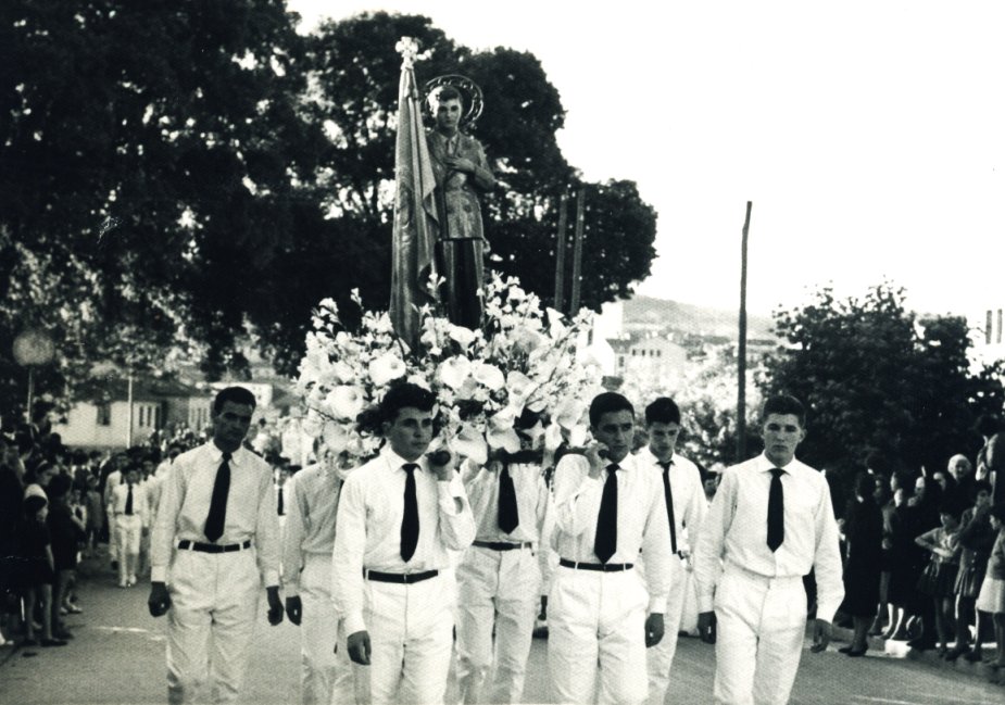 Fiesta del cincuentenario 1961. Procesión. Sto. Domingo Savio portado por Francisco, Peña, Chicho, Enrique y José Manuel. Fotografía añadida al archivo.