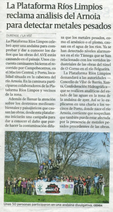 RÍO ARNOIA : prácticamente contaminado os vertidos do AVE están a pasarlle a misma factura que ó río TAMEGA. Arsénico, e plomo dabondo. Tamén puríns a tope nos dous últimos anos. A cantidade de auga está a salvar este río, quero decir o caudal, pero ollo que cada vez leva menos...