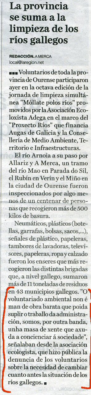 Están ben que Adega saque estos textos xa que a impresión que temos algúns, e non somos poucos, é que está facendo á Consellería de Medio Ambiente, xa non existe esa Consellería agora é de Medio Rural, ou como se chame, unha aportación que lle sae practicamente gratis, amén de facendo unha labor que lle corresponde a Xunta.