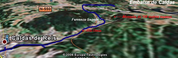 Encoro de Caldas de Reis. Entre o muro e a fervenza de Segade hai unha montaña estreita, en algúns lugares é de 150 metros e a una cota moi superior (de 125 m. a 114 m) . Esta é a montaña que os técnicos decían non se había estudiado. Os estudios xeológicos no eran os adecuados. Ver os estudios que poñen os pelos de punta.  Por certo Caldas de Reis está a poucos kms. desta zona (1.900 metros en liña recta. 3.000 metros seguindo o canle do río).