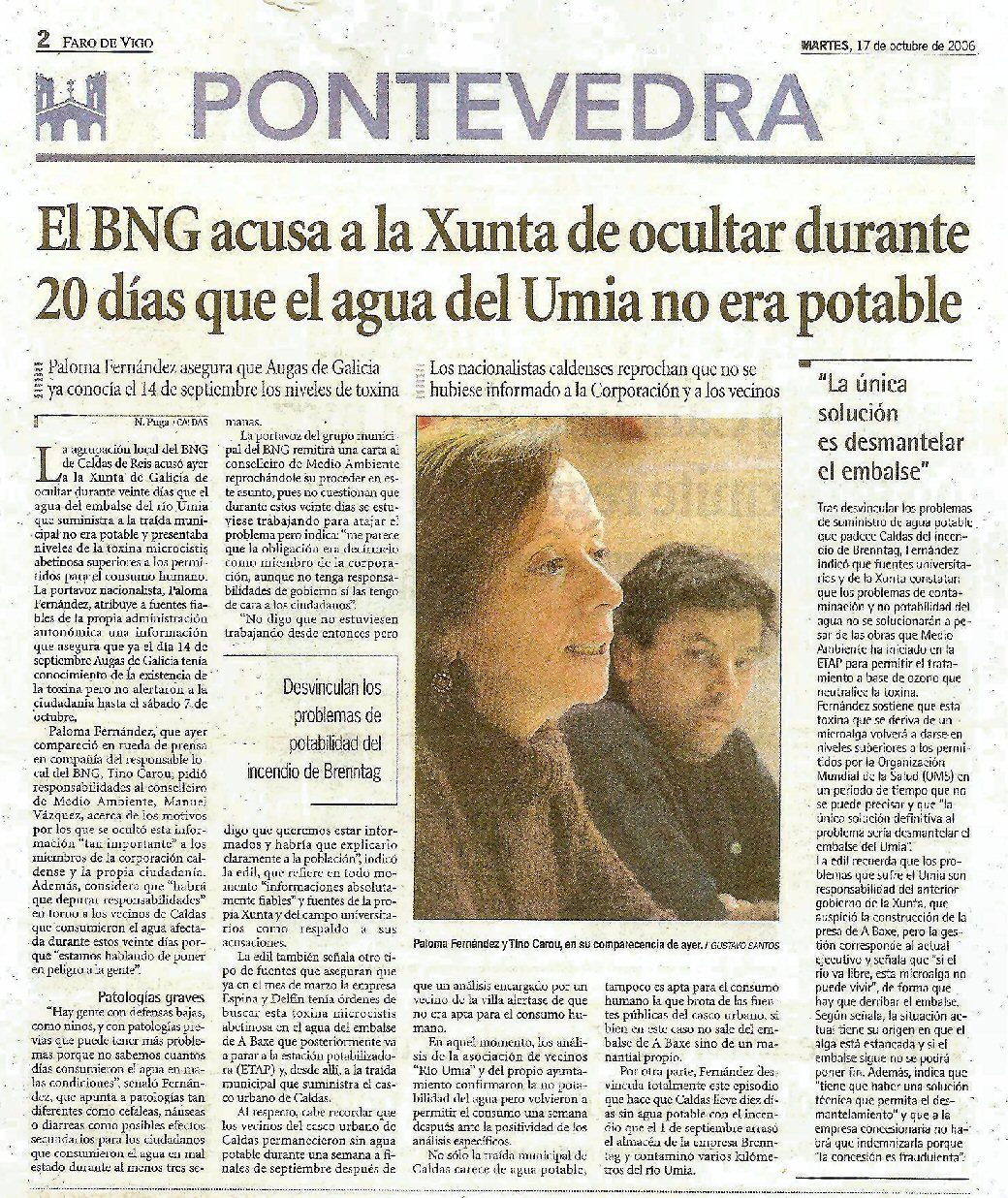 Non limparon absolutamente nada, houbo precipitación por rematalo, tiñan moita presa por motivos legais.... Agora vese a barbaridade, xa temos unha primeira a vista: no recente desastre do río Umia de setembro do  2006, coa  contaminación química,  non serve a auga do encoro para dar de beber a zona. Como vai servir si se eutrofiza en horas...Primeiro problema, cando l empresa Cortizo e a Xunta do P.P. comentaba que o encoro resolvía o problemas de auga do Salnés e máis...