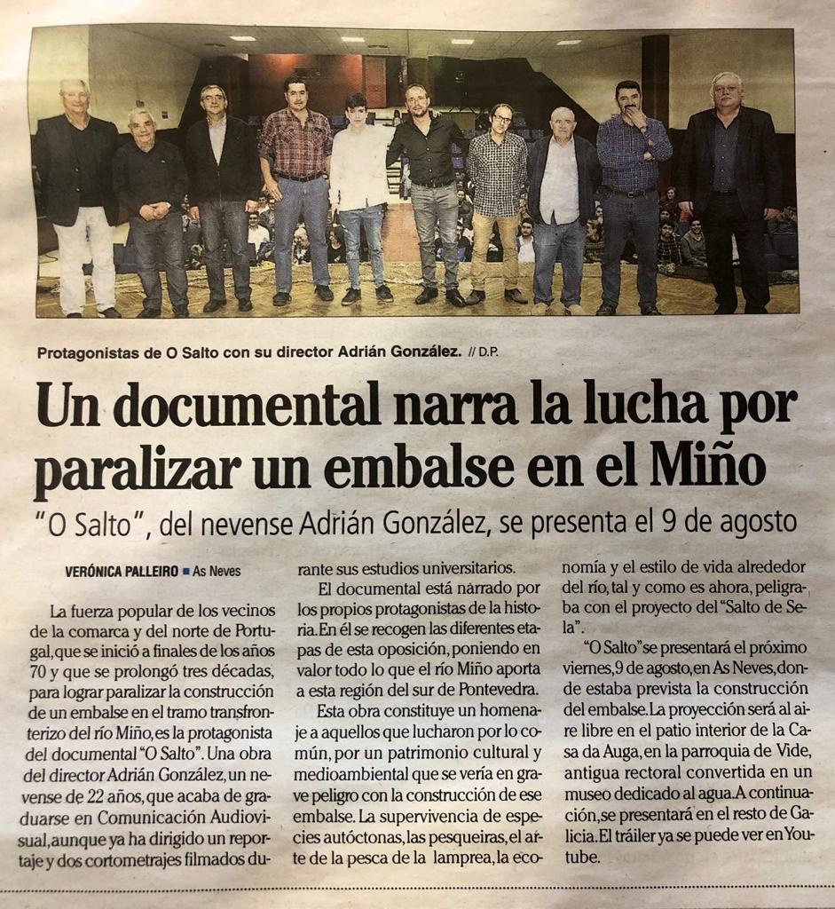 Comentario do video: "O Salto es un documental que recoge cómo la fuerza popular paralizó la construcción de un embalse en el tramo transfronterizo del río Miño, lucha que comenzó a finales de los 70s y duró a lo largo de 30 años. Narrado por los propios protagonistas de la historia, va recorriendo las diferentes etapas de esta oposición y poniendo en valor todo lo que el río Miño da a esa región del sur de Pontevedra" .