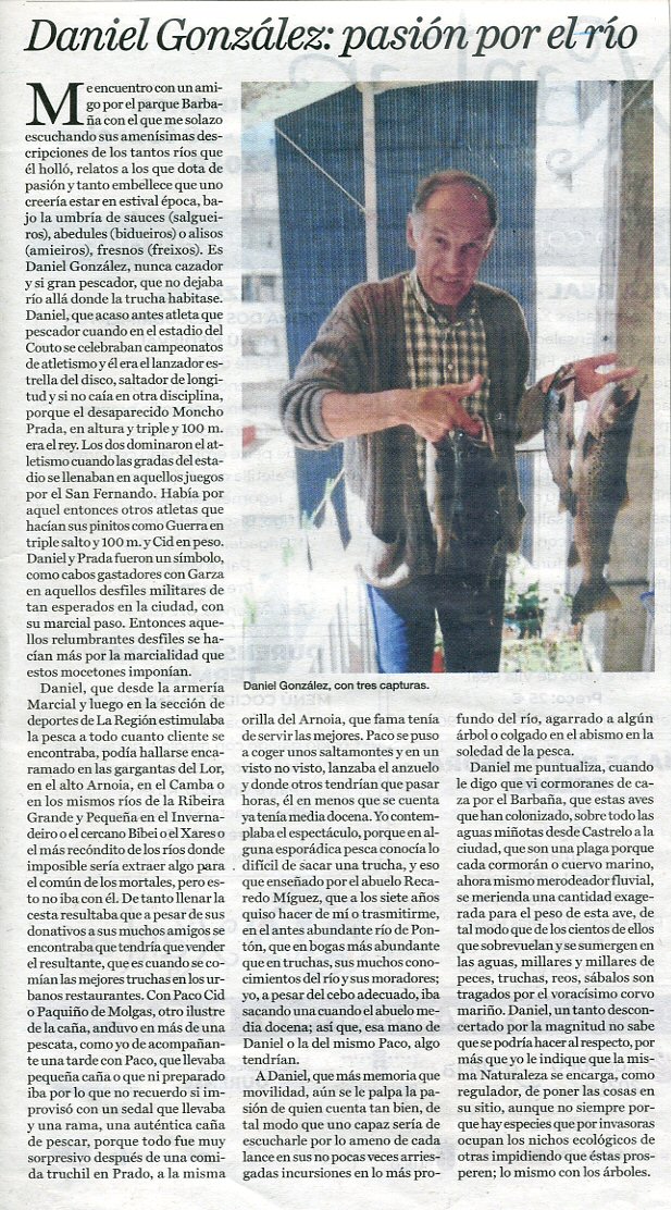 Hoxe non vai de pesca xa que está en desacordo coa persecución que se aplica sobre os pescadores honrados e por contra , a benevolencia que se ten cos autenticamente desaprensivos. ( La Región 29 abril de 1994).Daniel afirma: "que o que falla é a Administración , somos 25.000 pescadores, só en Ourense, e se nos unimos podemos lograr grandes cousas ". Pensa que se en Frieira e Castrelo Fenosa puxese escalas , o Miño sería sen dúbida o mellor coto de España ".
