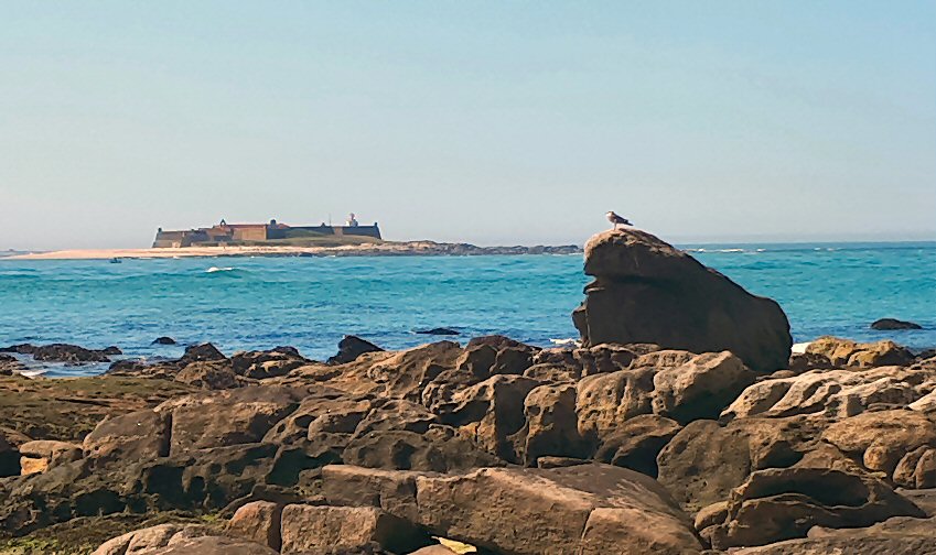 as rocas de Camposancos e a fortaleza portuguesa da Insua.