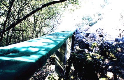 Inicio da miniescala para anguías. Inicio da miniescala para anguías visto máis de cerca. Observar a toma. Pura tecnoloxia punta. Así vai subindo sobre unhos 60 metros. Trátase dun caxetin, que leva por fora un plástico e unha rede. Teóricamente o caxetín vai cheo de auga e ten terra.