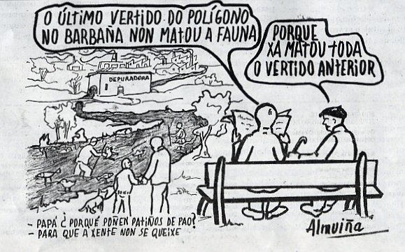 Eu penso que todos os galegos se deberan indignar de como están os nosos ríos, de qué auga estamos a beber e beberemos nuns anos como esto siga así, e de que a U.E. vai ver o mal que se invirtiu o diñeiro nestes anos, xa que de seguir estas actuacións non cumpliremos as normas e as nosas augas non se axustarán os parámetros lexislados.