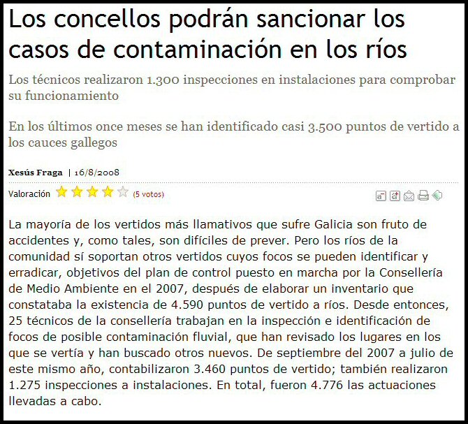 Esta noticia sácase de vez en cando na prensa, xa é a terceira vez que a vexo, a anterior o 30/04/2011 a última na Voz de Galicia do 26/07/2011. Agora fala de 41 centros que detectaron 355 vertidos, os mismos que en abril.... Nos ríos son 39 instaladas en 20 ríos. Deduzco que de abril do 2011 a agosto do 2011 non houbo casos que resolver, polo tanto a deducción é inmediata, hai que pensar que o sistema non debe ser moi efectivo...