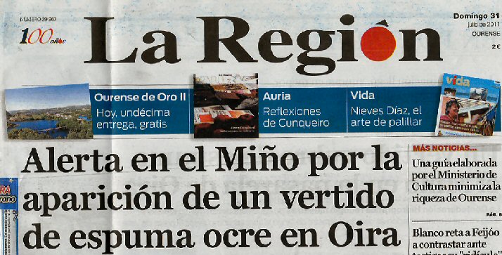 Río Miño, 30 de xullo do 2011, contaminado a altura de Velle. Neste lugar da fotografía de Miguel Angel é onde se toma a auga para Ourense cidade no verán. "Alerta no Miño pola aparición dun vertido ocre en Oira" dice La Región en primeira páxina. Pero é un vertido máis que pasará a papelera e que non terá culpables.