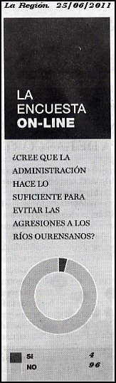 O sentir da xente está claro, un 96% dos ourensán consideran que a administración se lava as mans nuns ríos porcallentos; vamos que non fai nada en absoluto. Ese tamén é o meu sentir dende fai vinte anos...
