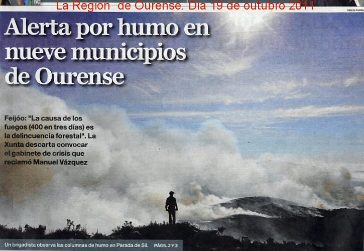 Esta imaxen e este título lembrame o "dos hilillos del Prestige". Dase a curiosidade que eu anduven o día 18 de outubro por estas paraxes acompañados de dous amigos. O que vimos non foron fumes, foron auténticos incendios que queimaban toda a zona entre a Teixeira e Valilongo (Celeiros, Pedrafita, Alende, Sistín...) . Había lumes tamén en Manzaneda, Chandrexa, Maceda e máis sitios...