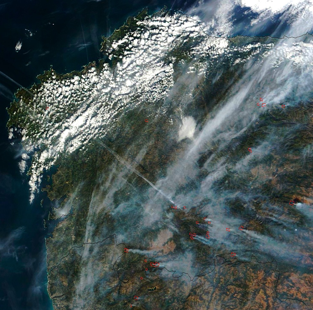 Fotografía da Nasa onde se ven os incendios na provincia de Ourense. Un desastre dunha xestión nefasta. 18/10/2011. Este ano non houbo prevención de ningún tipo, suprimiuse brigadistas que facían estas labores. Por contra nun alarde de irresponsabilidade por parte da Xunta pechouse a campaña en plena sequía e en plena canícula.