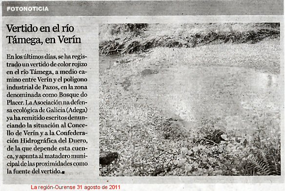 24.- O río Támega en Verín de cor bermella na zona que se chama O bosque do Placer. Este río é unha auténtica desfeita e fai anos que está defenestrado. A noticia é da Región de Ourense do día 31-agosto-2011. Unha máis na provincia. Seica o culpable é o matadeiro pero nin se sabe nin se sabrá... A reseña na prensa está posta abaixo.