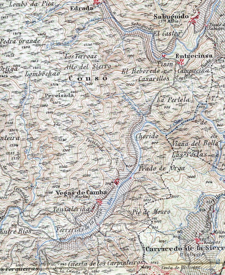 Este mapa es de 1943. En el está Vegas de Camba y el río Camba y su entorno. Concretamente la presa se hizo en 1972-74 en el estrecho que se vé entre La Pertela y Las portas, concretamente donde pone Camba. Como siempre se aprovecha donde sea más fácil de construir la presa. Embalsa mucha agua ya que mientras Veigas de Camba estaba a 800 metros aproximadamente formaba un llano en donde en los alrededores hay alturas de más de 1000 metros.