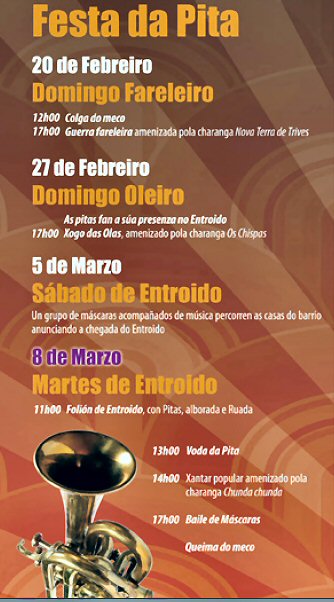 Este año como los anteriores el día clave es el domingo de Carnaval que cae a 6 de febrero, domingo, día en el que se celebra la Fiesta del Cabrito que va ya por la XX edición. Ese día hay actos desde las 11 de la mañana con desfile de los Folións a las 12. La comida es a las dos.