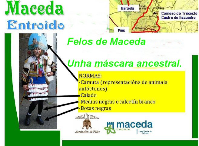 | Detalle del recorrido que harán los felos el sábado día 5 de marzo. La comida será a las 14 horas. | Felo de Maceda, máscara también ancestral del carnaval de Ourense Provincia. |