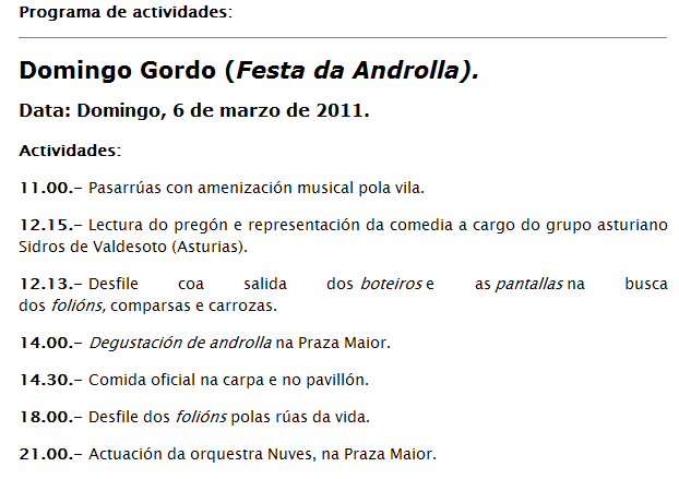 Este año como los anteriores el día clave es el domingo día 6 de febrero, domingo, que se celebra la Fiesta de LA ANDROLLA que va ya por la XLI edicción. Ese día hay actos desde las 11 de la mañana con desfile de los Folións a las 12. La comida es a las 14:30 horas..