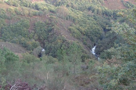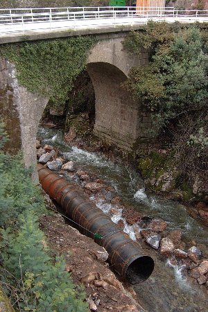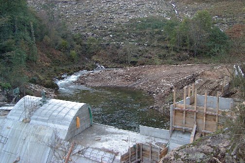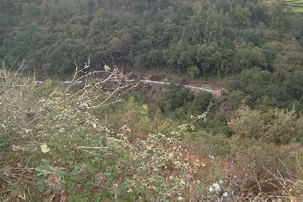 | La fotografía está sacada desde Torneiros y justo se ve enfrente un basurero. Debajo justo están haciendo la minicentral. Un pequeño cañón con mucho encanto. Un fondal diría el alcalde. | La minicentral está bastante avamzada, en la fotografía el conducto de la tubería hasta las turbinas. Como en todas el desbroce fue al río. Repito según el alcalde un fondal. |