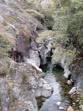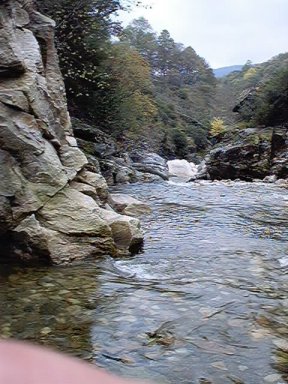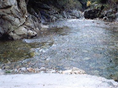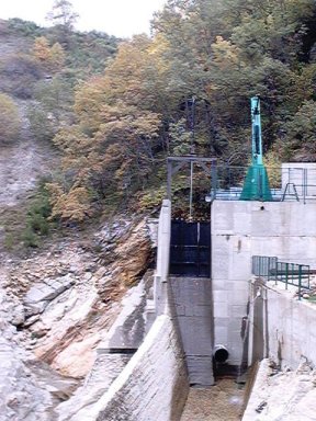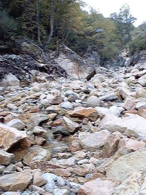 | Ver la zona de abajo de la central, el río con corriente de octubre. Por encima el caudal ecológico: un grifo de agua, ni un litro por segundo. De vergüenza. | Este es el río justo debajo de la turbina de la central, el río llevaba agua abundante. |