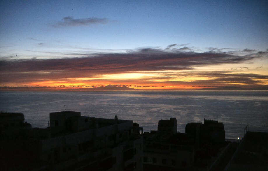 Esta para min sensacional fotografía e un amanecer na illa da Palma, concretamente en Sta. Cruz da Palma, no ano 1978. O que se ve lonxe e o Teide (Tenerife), hai 100 km. máis ou menos dende a Palma. Moitos dias dende a azotea da casa onde vivíamos saquei estas marabillas, pero nunca vin o raio verde. A luz que teñen as Canarias é única...Cantas lembranzas como esta...