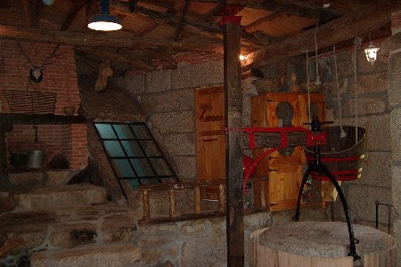 | Interior do muíño. Peza que levanta a moa do muiño e cama para o muiñeiro. Ten ata unha lacena para a comida do muiñeiro. Non falta detalle. | Interior do muíño. A dereita o inferno do muíño co rodicio e a salida da auga cara o regato. |