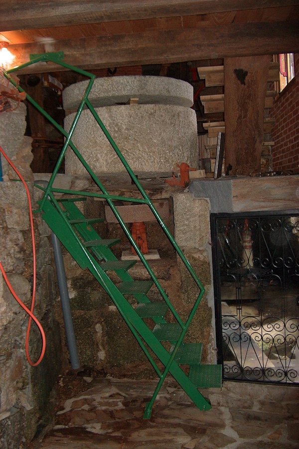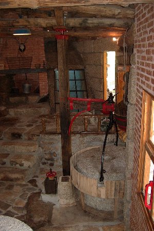 | Interior do muíño. | Interior. En primeiro plano a moa . |