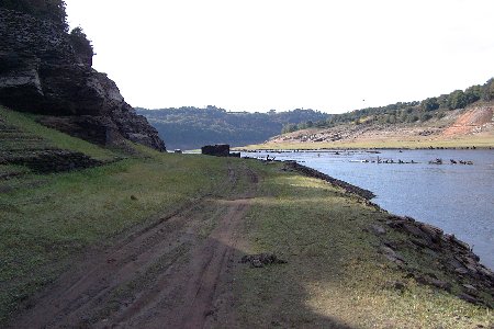 das augas dun encoro. En frente, hoxe baixo as augas do encoro de