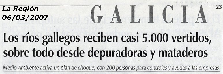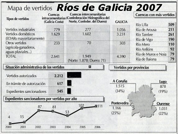 Ante esta sensacional noticia del nuevo equipo de Medio Ambiente de la Xunta de Galicia (marzo del 2007) solo me queda divulgar la noticia y mostrar mi esperanza de que: ¡Por fin se empieza a mirar, de verdad, por los ríos gallegos! Los datos de vertidos son los siguientes: