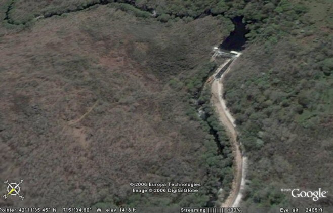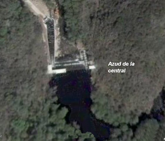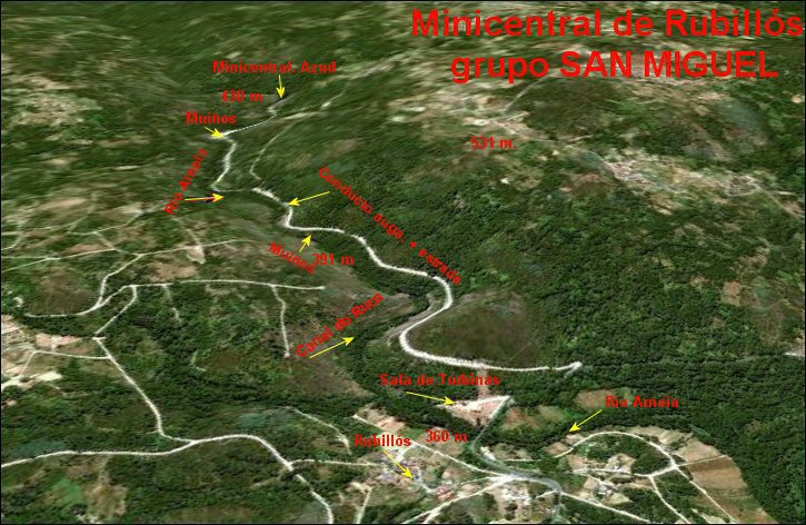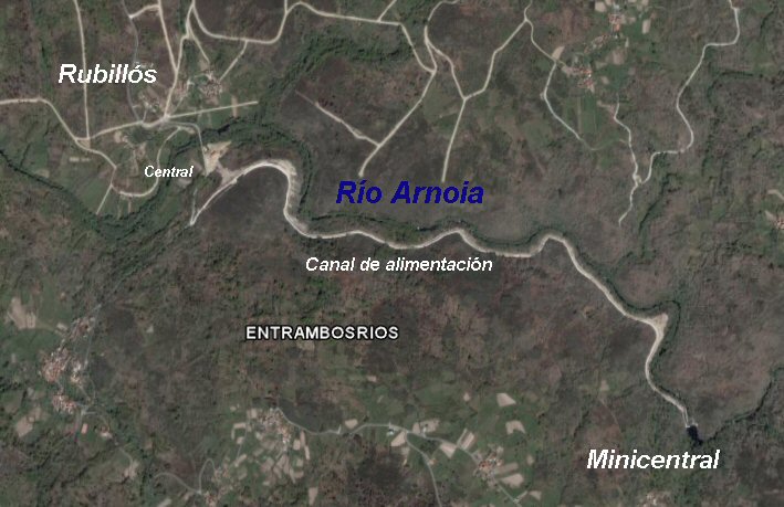 No dibuxo, está a vista real a 17/08/2010 (sacado de Google Earth vese o Canón do Arnoia nese lugar, onde está realizada a minicentral. Entre o alto do canón e o canal hai sobre uns 200 metros de diferencia e o río, na maior parte dos lugares sobre 15 m.)