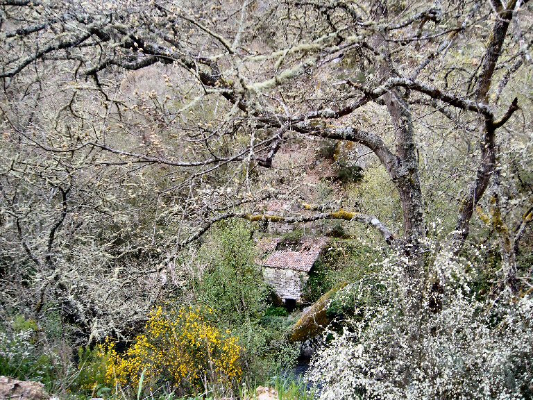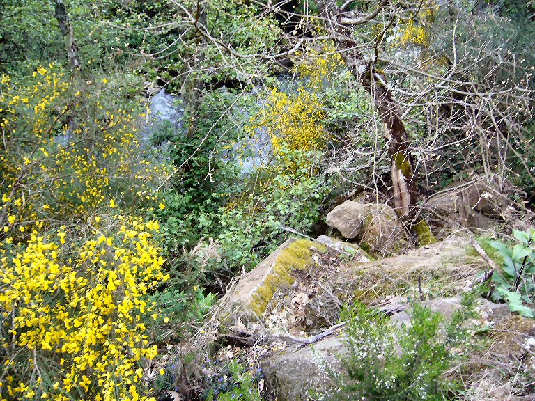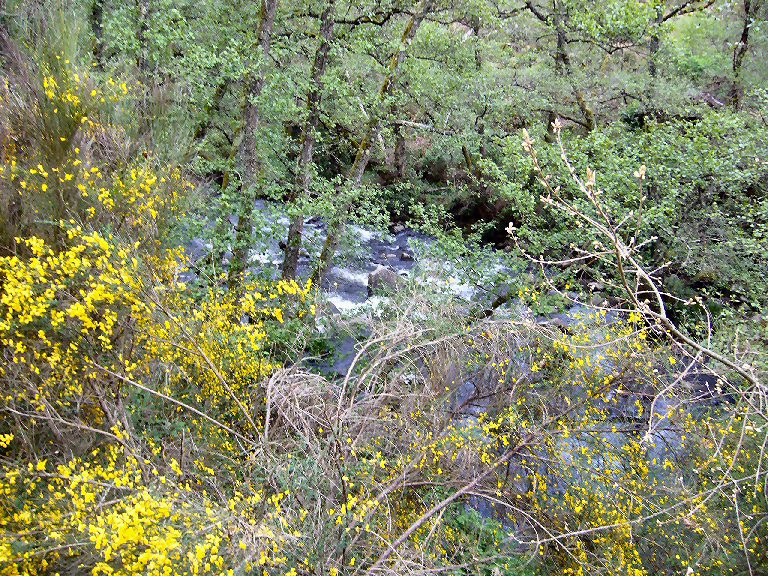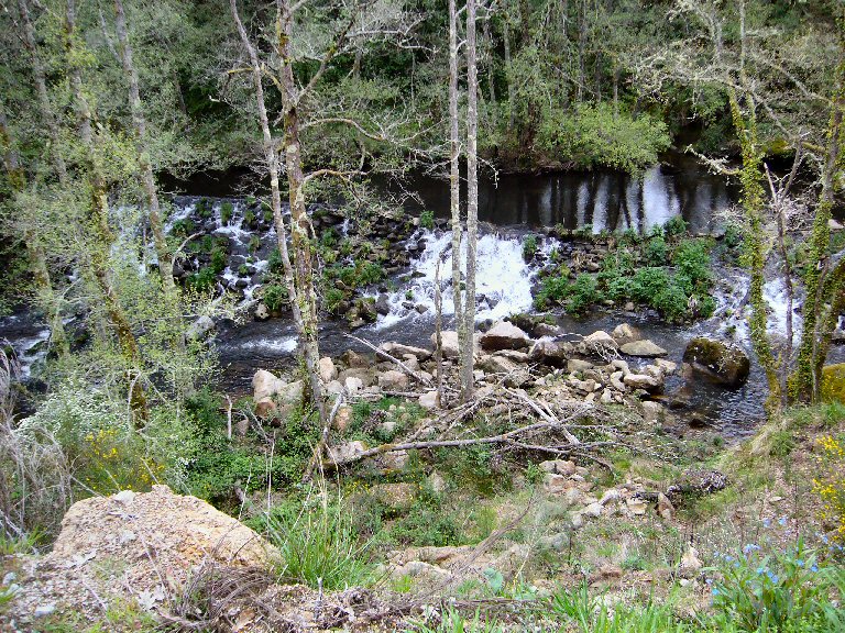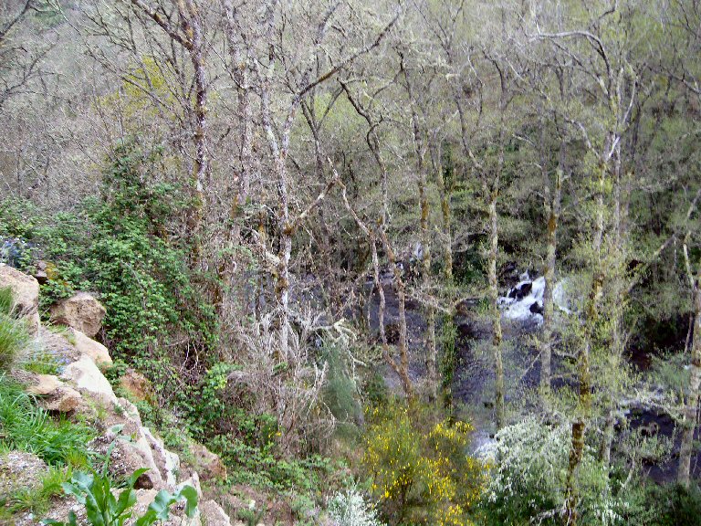 Bosque de ribeira ou galería desgraciado sobre todo na parte esquerda do río, onde as árbores e a vexetación non crecen debido o escombro e seguramente o baixo caudal do río, o caudal do 10% do caudal medio é unha arma mortal para estas ribeiras, inda que sexa legal, non vale para os nosos ríos. Pasa o mismo que co bosque de ribeira do Barbantiño por debaixo da fervenza, uhna mágoa auténtica. Claro que esto quedou inda peor. O aspecto é deplorable e deprimente.